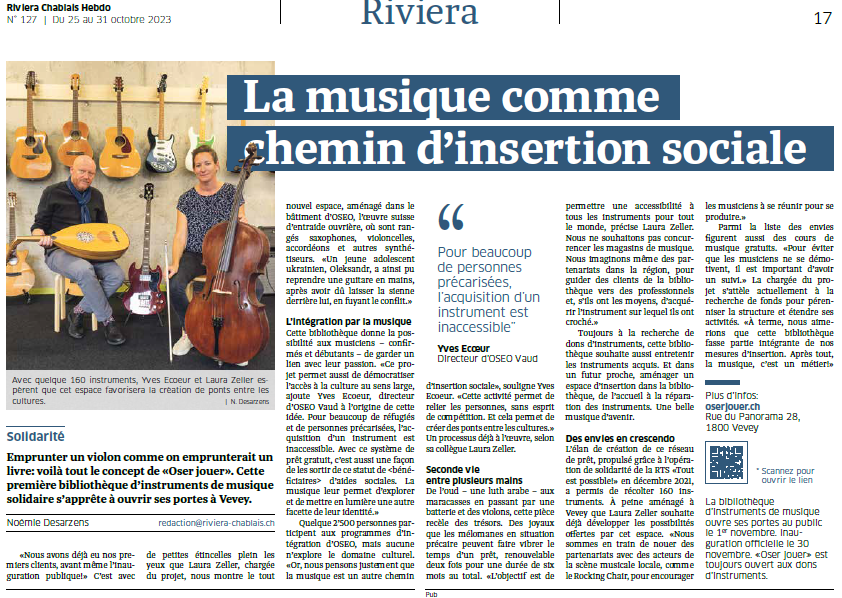 «Nous avons déjà eu nos premiers clients, avant même l’inauguration publique!» C’est avec de petites étincelles plein les yeux que Laura Zeller, chargée du projet, nous montre le tout nouvel espace, aménagé dans le bâtiment d’OSEO, l’œuvre suisse d’entraide ouvrière, où sont rangés saxophones, violoncelles, accordéons et autres synthétiseurs. «Un jeune adolescent ukrainien, Oleksandr, a ainsi pu reprendre une guitare en mains, après avoir dû laisser la sienne derrière lui, en fuyant le conflit.»